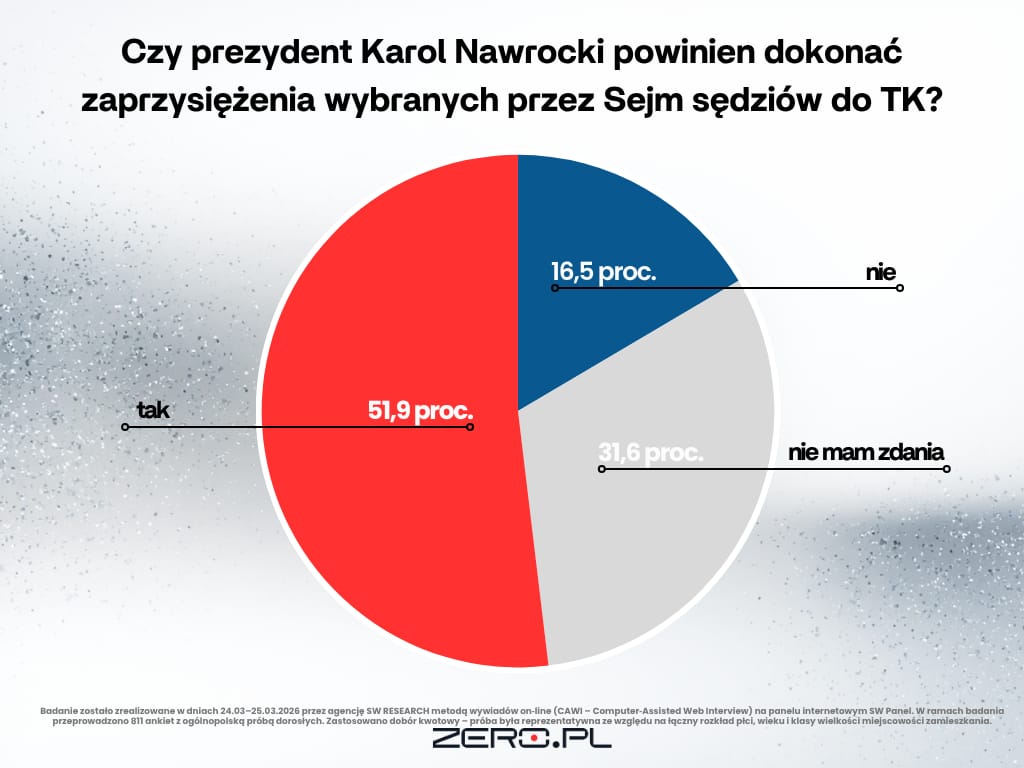 W sondażu przeprowadzonym na zlecenie Zero.pl przez pracownię SW Research zapytaliśmy Polaków o to, czy prezydent Karol Nawrocki powinien dokonać zaprzysiężenia wybranych przez Sejm sędziów do Trybunału Konstytucyjnego.