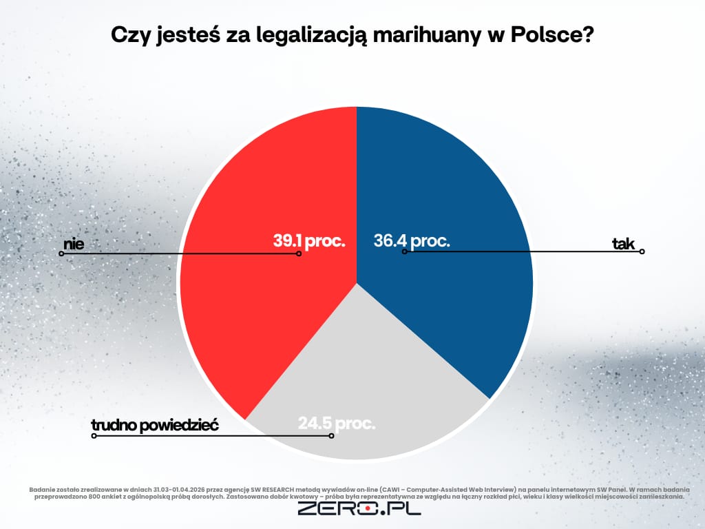 Wyniki nie są jednoznaczne. Zdaniem 36,4 proc. badanych marihuana w Polsce powinna zostać zalegalizowana. Przeciwnego zdania jest 39,1 proc. respondentów, a blisko co czwarty Polak (24,5 proc.) nie ma w tej kwestii wyrobionej opinii.