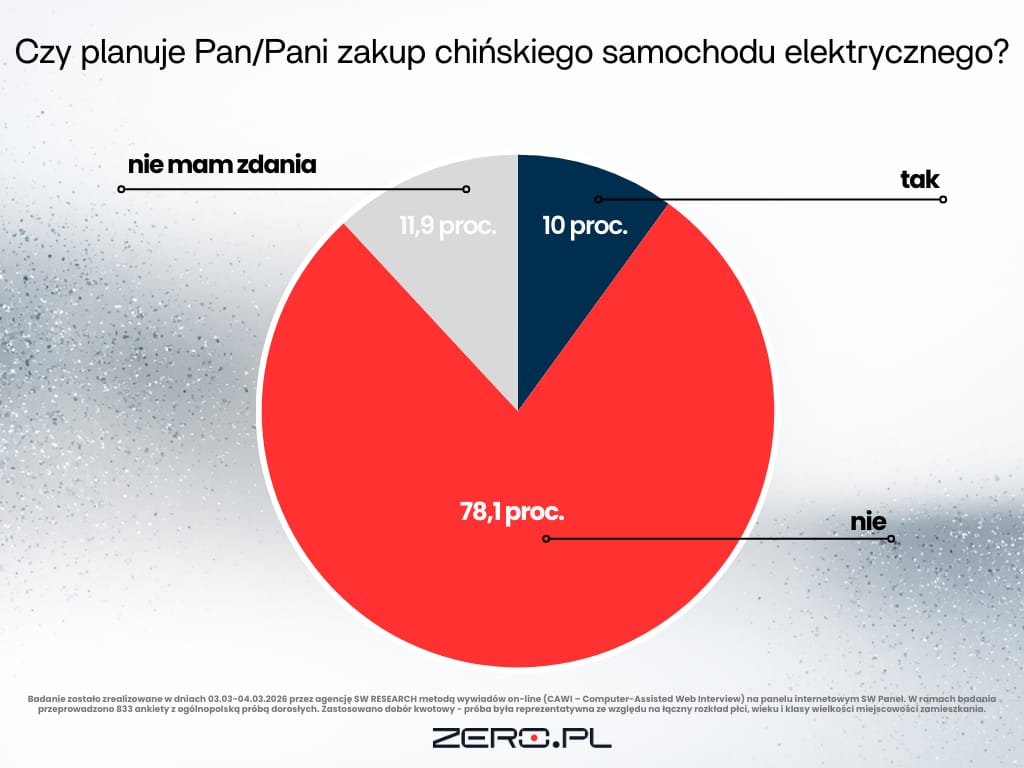 - Z sondażu SW Research dla Zero.pl wynika, że zdecydowana większość Polaków na ten moment w ogóle nie rozważa zakupu chińskiego auta elektrycznego.