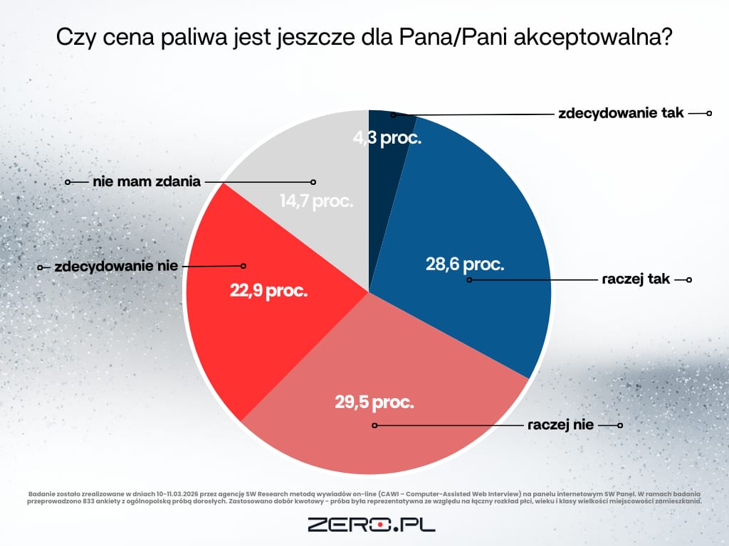 - Z sondażu SW Research dla Zero.pl wynika, że ponad połowa respondentów krytycznie odnosi się do cen paliw, które rosną od momentu ataku na Iran.