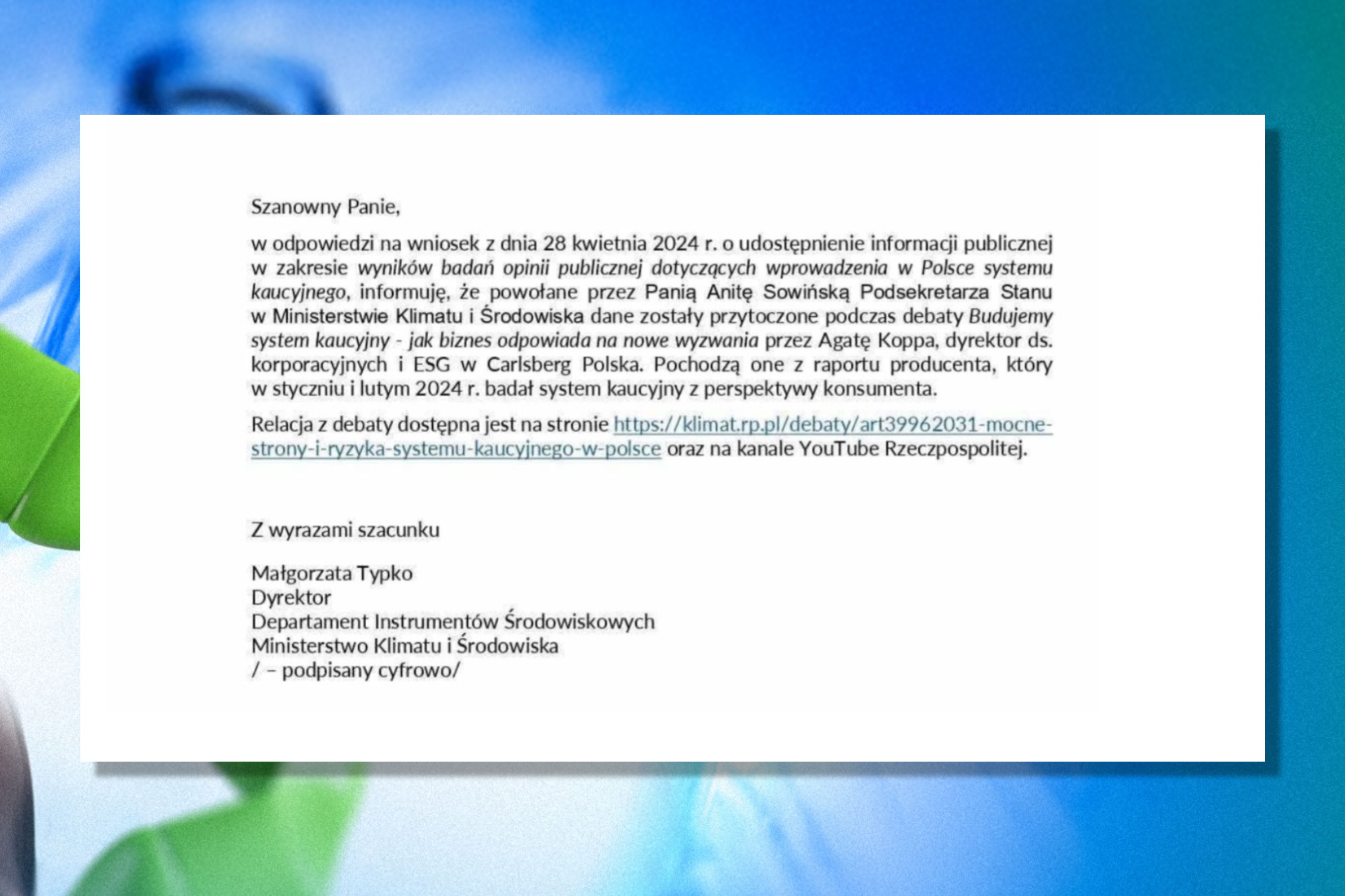 Dotarliśmy do pisma, które ujawnia tych „interesariuszy”. W odpowiedzi na wniosek o informację publiczną złożony przez Macieja Kiełbusa z kancelarii Ziemski & Partners, resort przyznał, że wiceminister Anita Sowińska posługiwała się danymi, których źródłem była Agata Koppa, dyrektor ds. korporacyjnych i ESG w Carlsberg Polska. “Pochodzą one z raportu producenta” – czytamy w piśmie.
