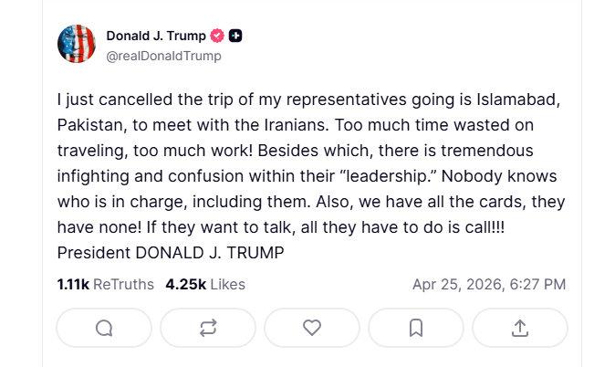 Wpis Donalda Trumpa na Truth Social. 25 kwietnia 2026 r. (fot. Truth Social, https://truthsocial.com/@realDonaldTrump/posts/116466283877725023)
