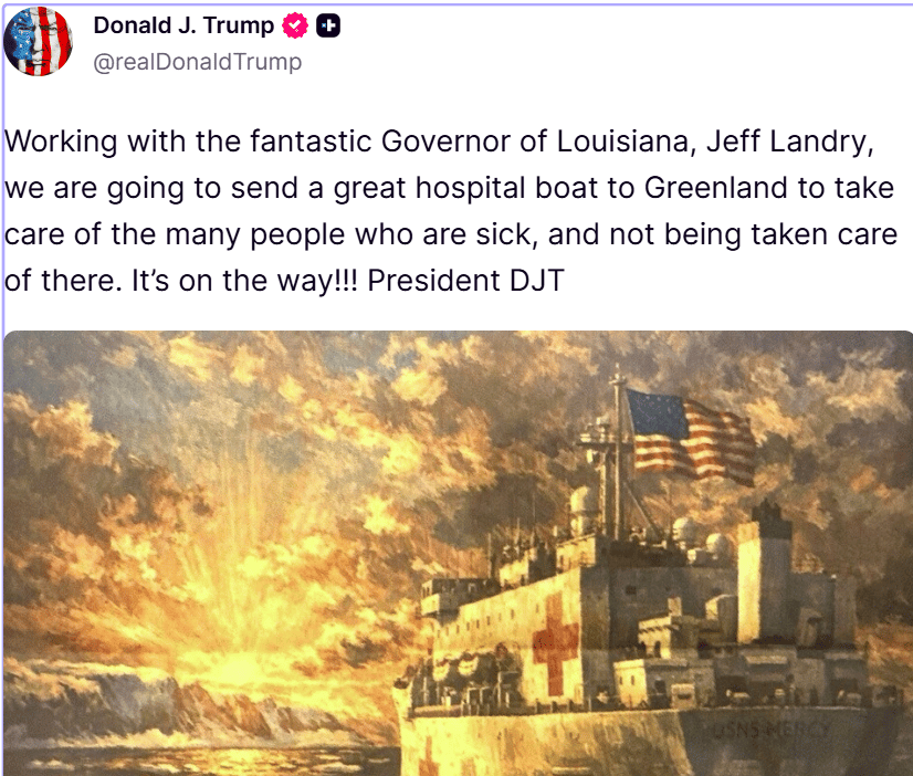 - Donald Trump ogłosił na platformie Truth Social, że "duży statek medyczny" jest już w drodze na Grenlandię, by pomóc "wielu chorym".