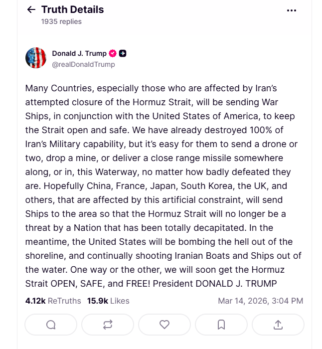 Wpis Donalda Trumpa na Truth Social o odblokowaniu Cieśniny Ormuz. 14 marca 2026 r. (fot. Zero.pl / Truth Social)