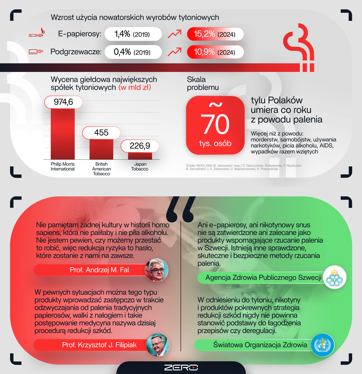 „Narracja o »redukcji szkód« stanowi element strategii przemysłu tytoniowego, który wprowadza kolejne »nowoczesne« produkty, aby utrzymać zyski i dotrzeć do młodych osób podatnych na uzależnienia i działania marketingowe” – pisze dr hab. n. med. Łukasz Balwicki, konsultant krajowy w dziedzinie zdrowia publicznego, w stanowisku z 1 grudnia 2025 r. I dodaje, że w Polsce widzimy tego konsekwencje: gwałtownie wzrasta używanie e-papierosów, tytoniu podgrzewanego i saszetek nikotynowych, a wiek inicjacji ulega obniżeniu.