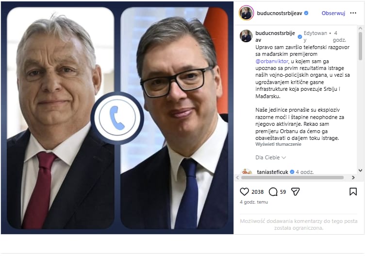„Właśnie zakończyłem rozmowę telefoniczną z premierem Węgier, Viktorem Orbanem, podczas której poinformowałem go o wstępnych wynikach śledztwa prowadzonego przez nasze służby wojskowe i policyjne w sprawie zagrożenia dla kluczowej infrastruktury gazowej łączącej Serbię i Węgry” – napisał w niedzielę Aleksandar Vučić na Instagramie.