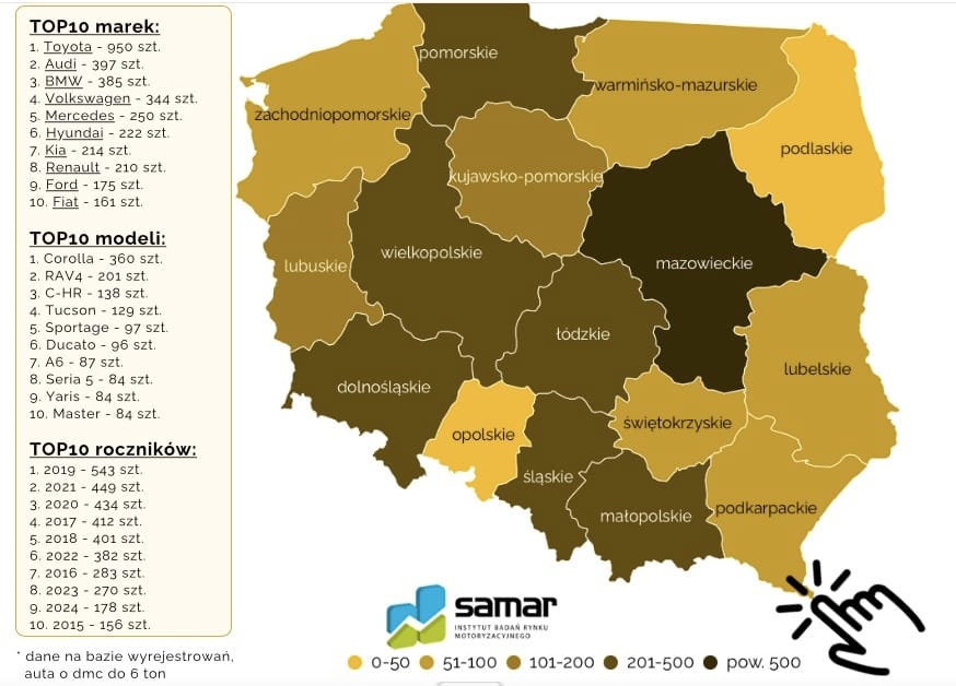 W pierwszej dziesiątce kradzionych aut mamy cztery Toyoty i dwa popularne auta dostawcze, tj. Fiata Ducato i Renault Master. Niechlubną pierwszą dziesiątkę uzupełnia BMW serii 5, Audi A6, Hyundai Tucson i Kia Sportage.