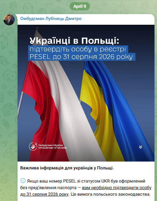 „Jeśli numer PESEL ze statusem UKR został nadany bez okazania paszportu – należy potwierdzić swoją tożsamość do 31 sierpnia 2026 r. Jest to wymóg polskiego prawa” – napisał na Telegramie Łubinec.