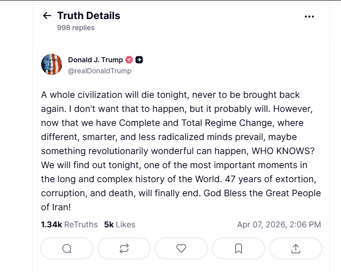 „Cała cywilizacja umrze dziś w nocy i nigdy nie zostanie przywrócona. Nie chcę, żeby tak się stało, ale prawdopodobnie tak się stanie” – napisał Trump na Truth Social.