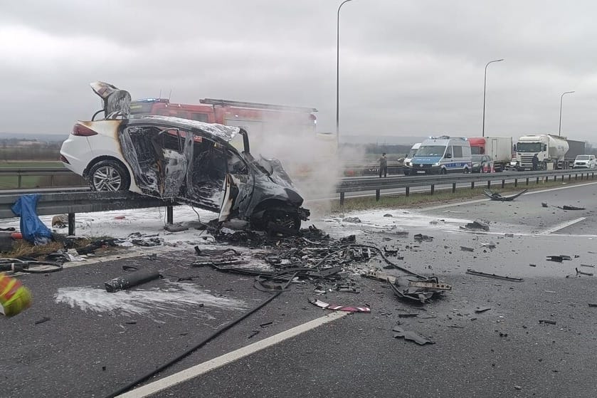 Koreańskie auto stanęło w ogniu i odrzucone zostało na oddzielające pasy ruchu bariery. Jego kierowca zginął na miejscu. W wypadku ranne zostały dwie osoby.