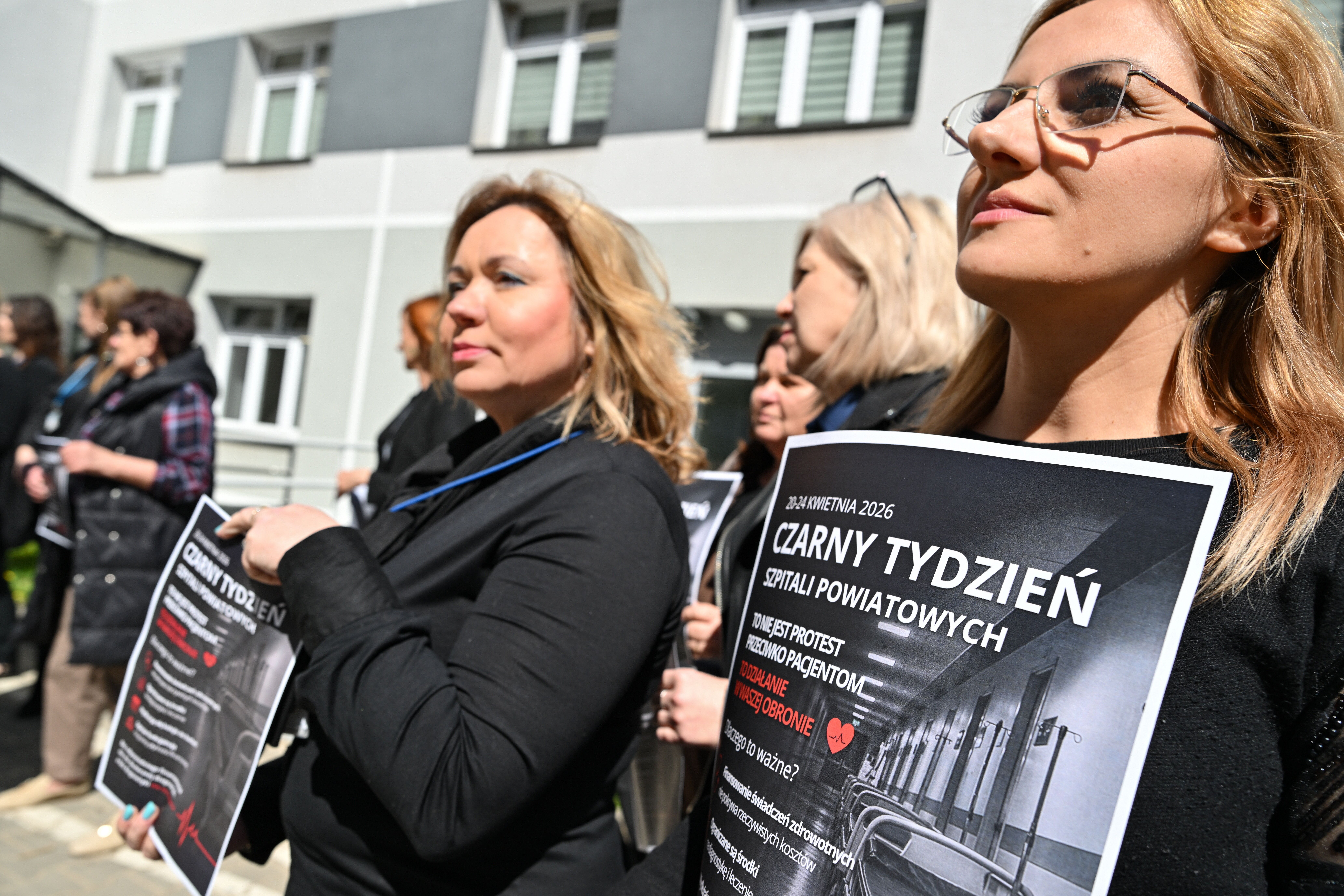 Starachowice, 22.04.2026. Pracownicy Powiatowego Zakładu Opieki Zdrowotnej w Starachowicach protestują przed siedzibą placówki, 22 bm. Pikietę zorganizowano w ramach ogólnopolskiej akcji protestacyjnej organizowanej przez Ogólnopolski Związek Pracodawców Szpitali Powiatowych. Protest, który odbywał się w dniach 20–24 kwietnia 2026 roku, jest częścią „Czarnego Tygodnia Szpitali Powiatowych” – inicjatywy będącej reakcją na pogłębiający się kryzys systemu ochrony zdrowia. (ad) PAP/Piotr Polak (fot. Piotr Polak / PAP)