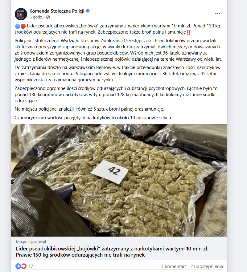 Warszawscy policjanci z Wydziału ds. Zwalczania Przestępczości Pseudokibiców poinformowali o zatrzymaniu dwóch przestępców podczas przeładunku narkotyków.