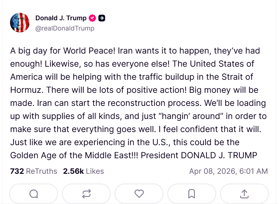 Zdaniem Trumpa, rozejm będzie „obustronny”, a w rozmowach na temat długoterminowego pokoju nastąpił znaczący postęp. W kolejnym wpisie republikanin zapewniał, że dwutygodniowe, obustronne zawieszenie broni jest wielkim dniem dla światowego pokoju.